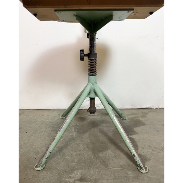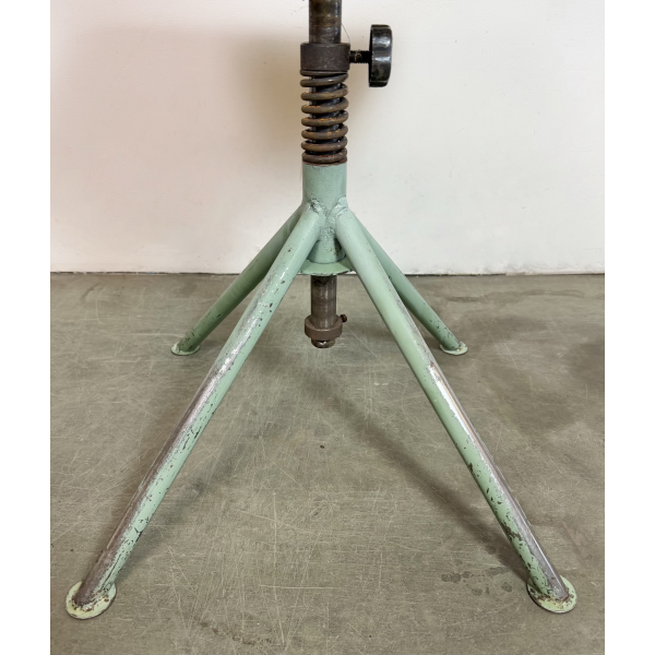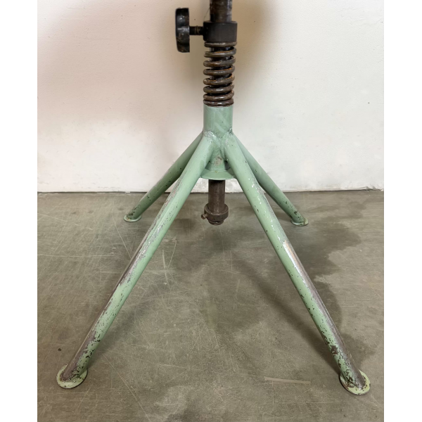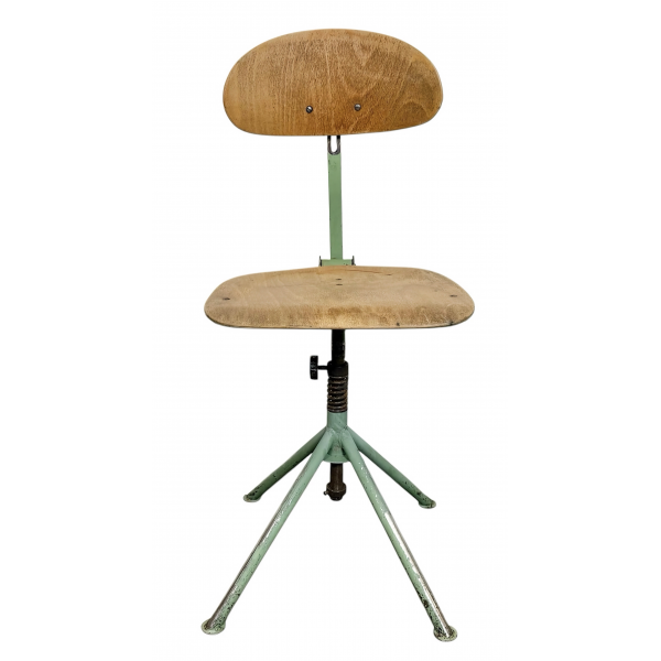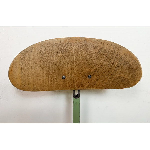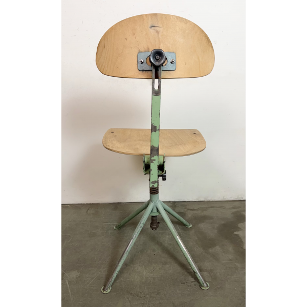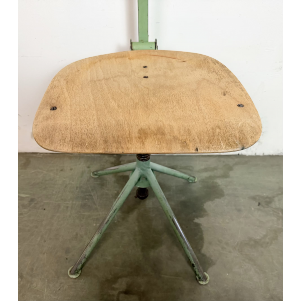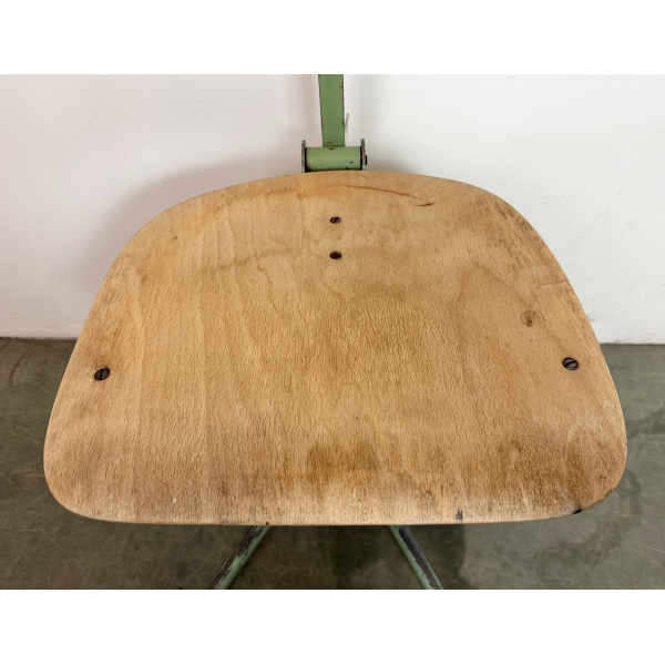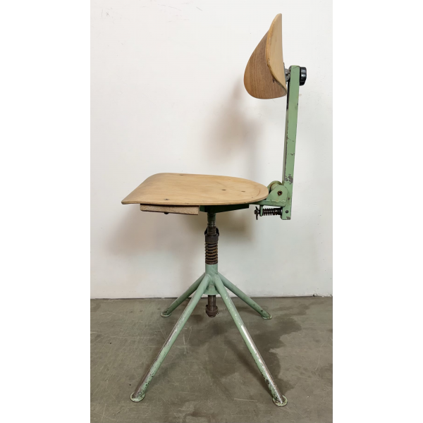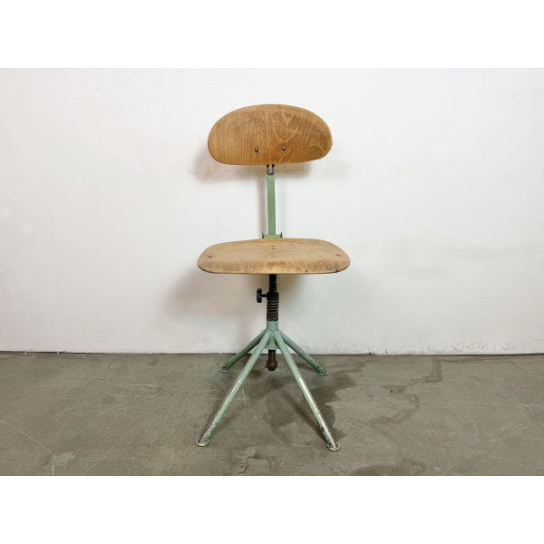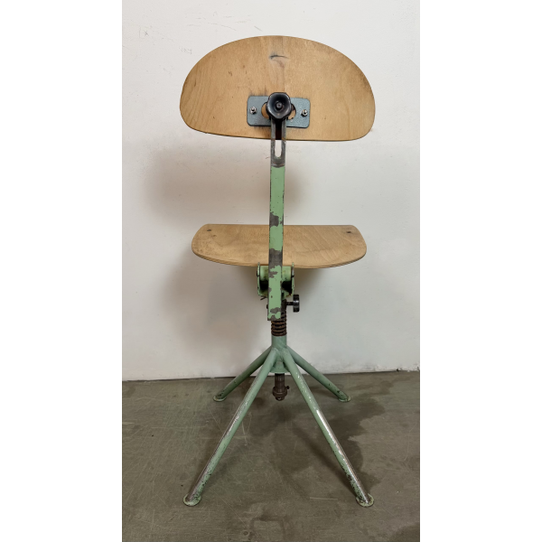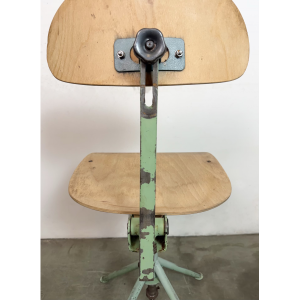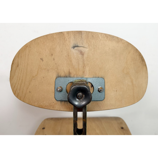 stará dílenská židle, , vše plně funkční, odpružení sedáku i opěrky, vyrobeno v Československu 30. - 70. léta. Židle má kovovou konstrukcí. Sedák s opěrkou jsou dřevěné