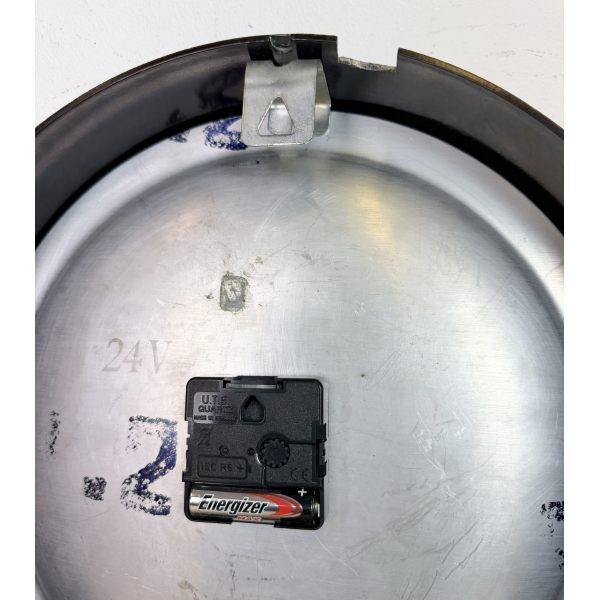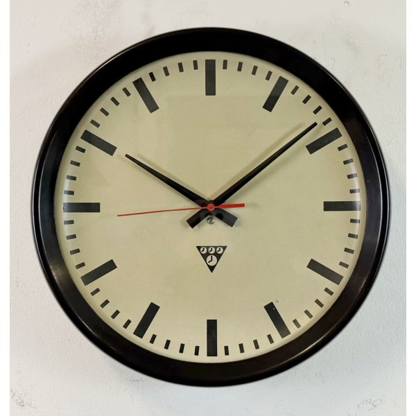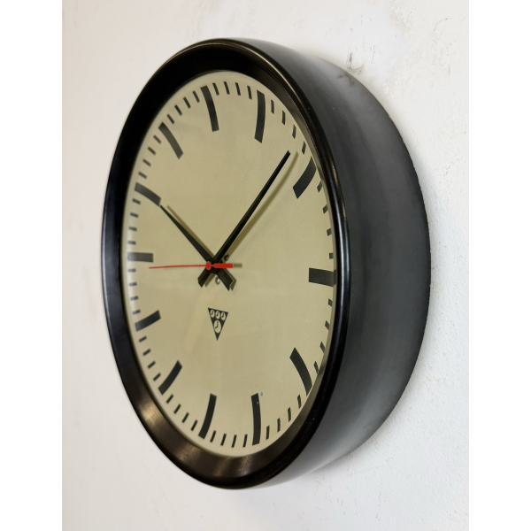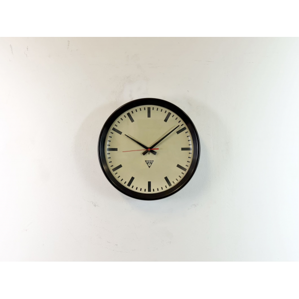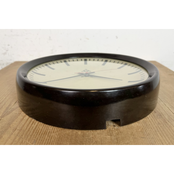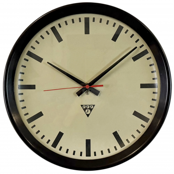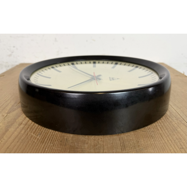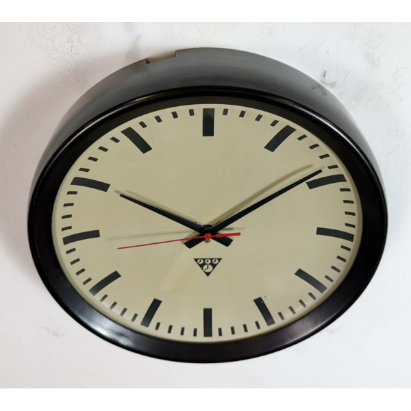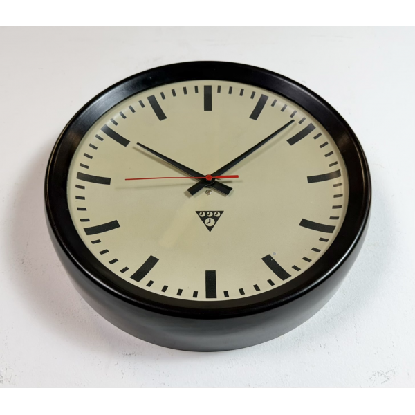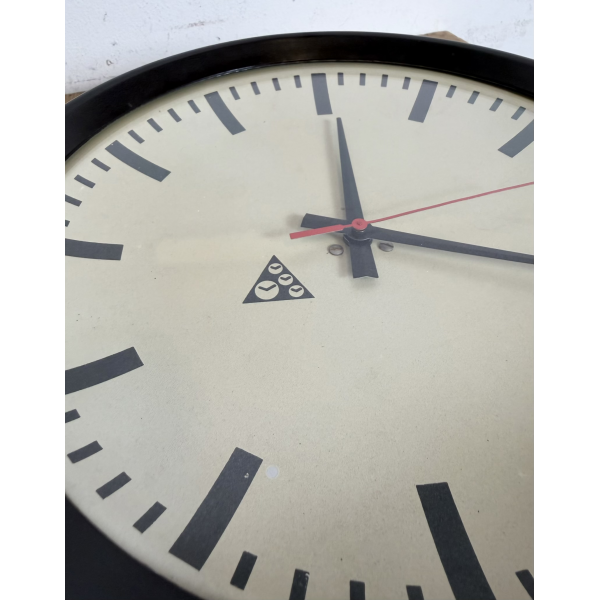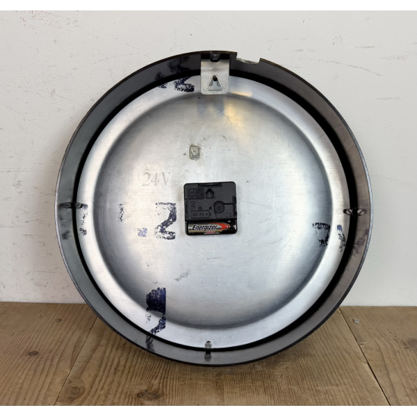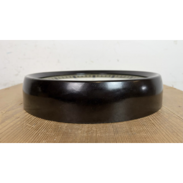 staré industriální hodiny, bakelitový rámhodiny jsou funkční , strojek na baterieRozměry: průměr 32 cm , 6 cm výška od zdi, váha 1 kg |