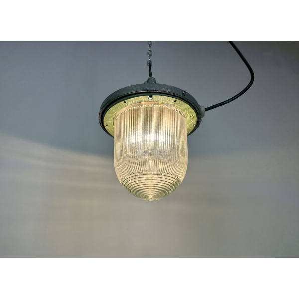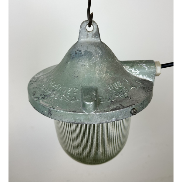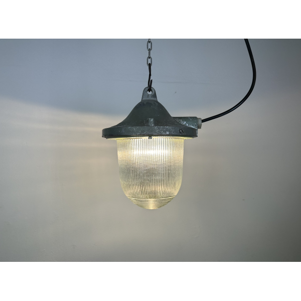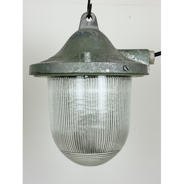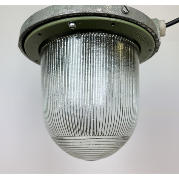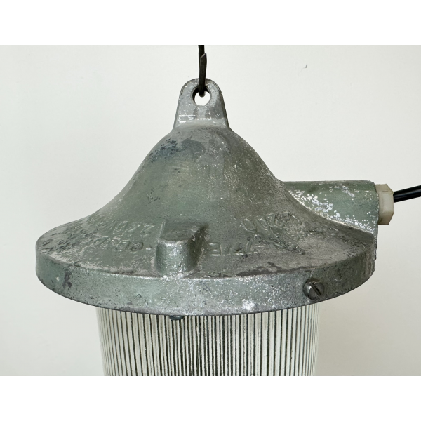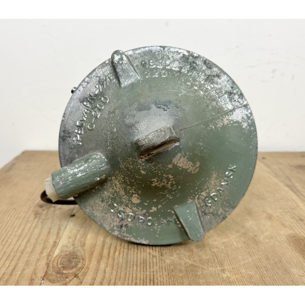 Tovární lampa s ochrannou mřížkou, kovová  konstrukce, původně určena do výbušného prostředí