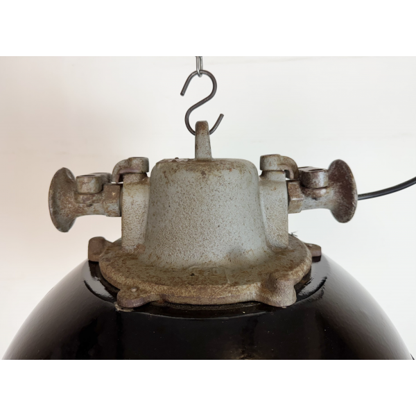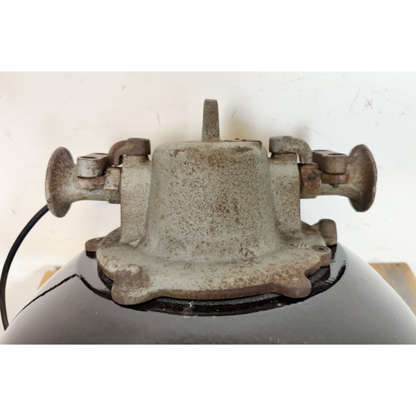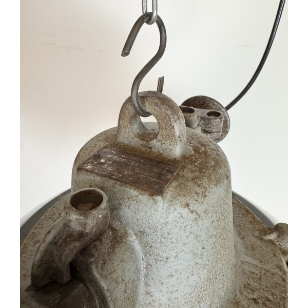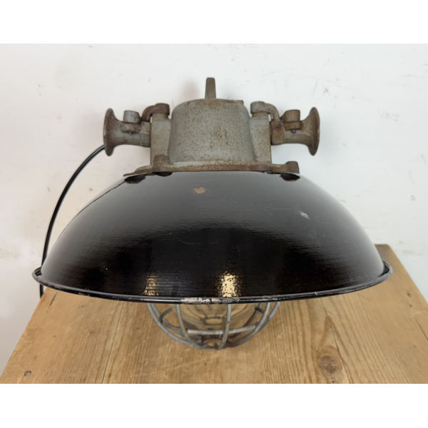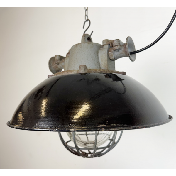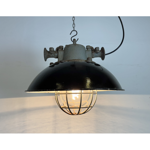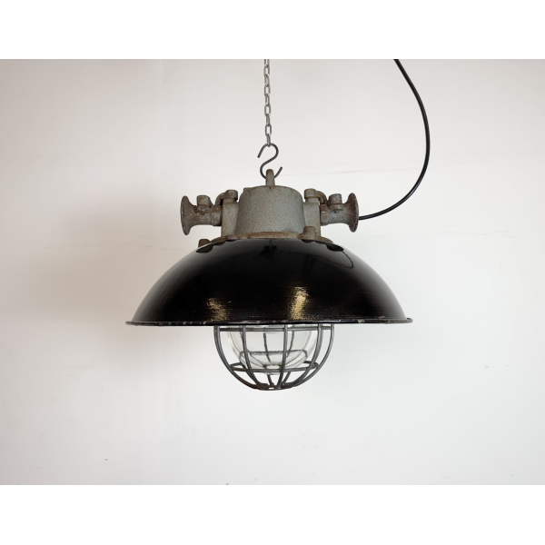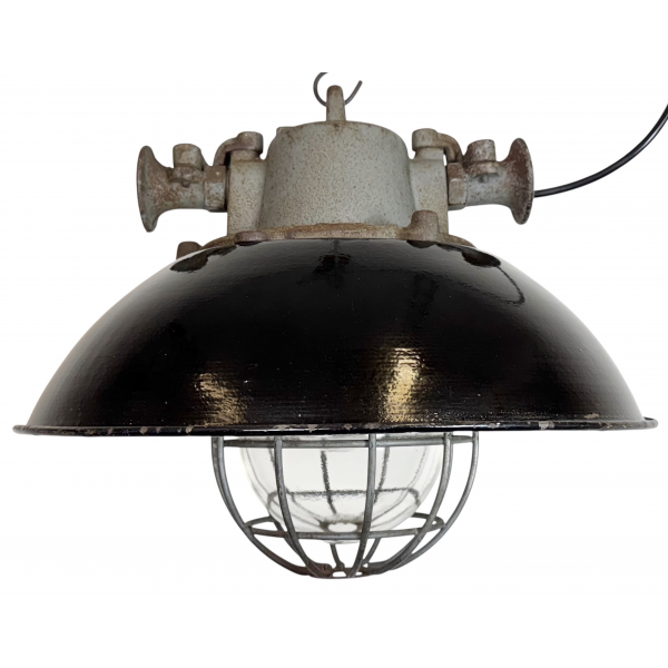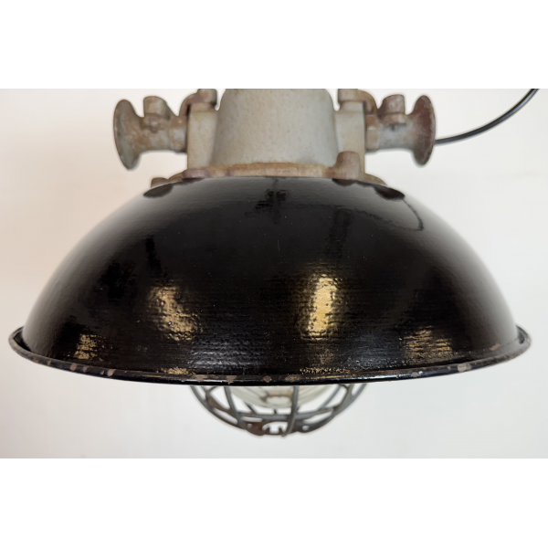 Tovární lampa s ochrannou mřížkou, kovový smaltovaný širm, původně určena do výbušného prostředí, v interiéru vypadá velice zajímavě