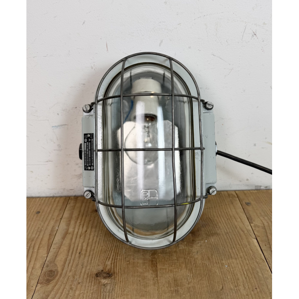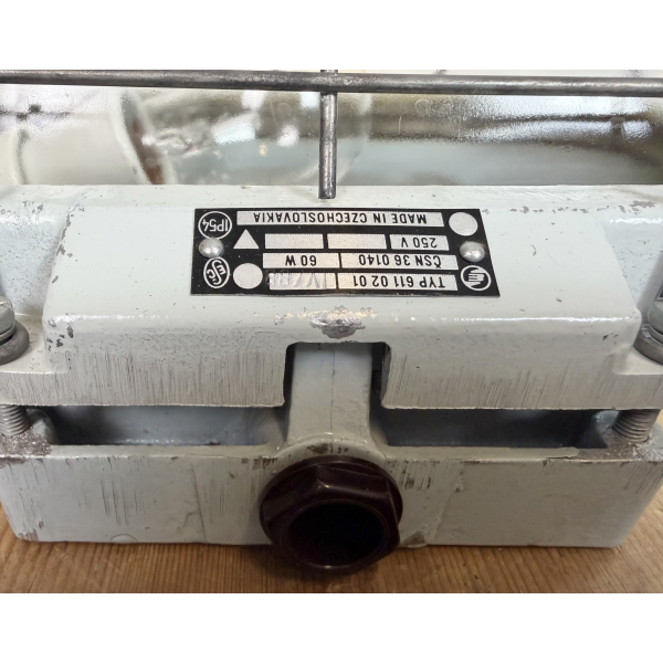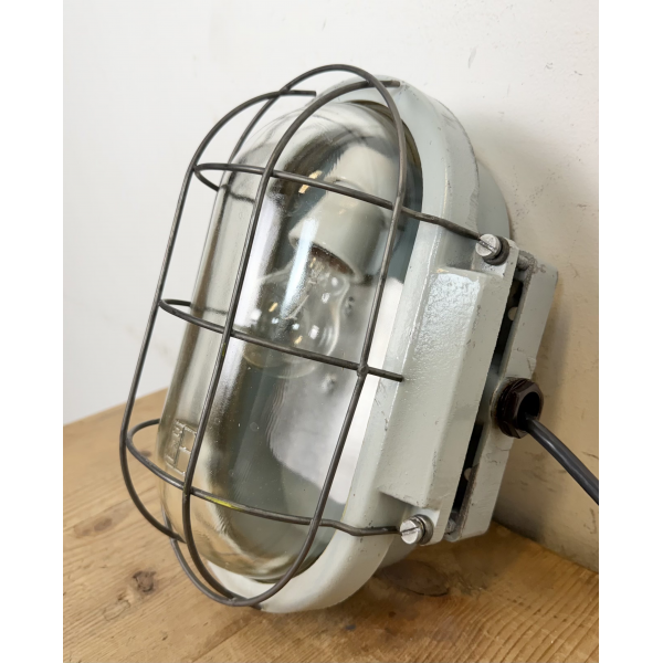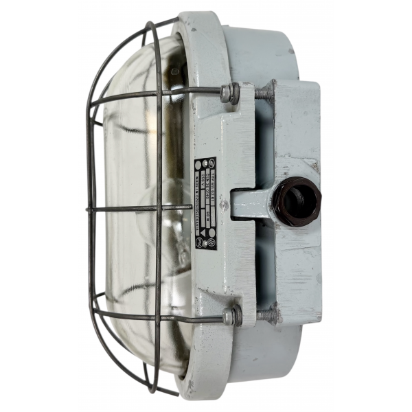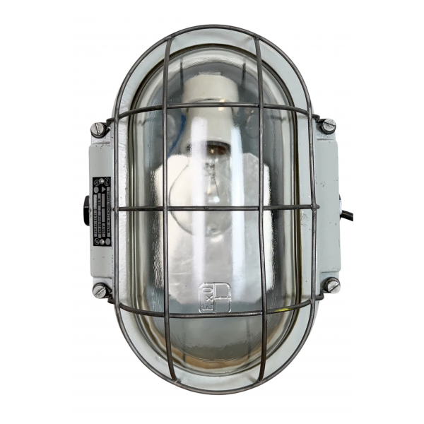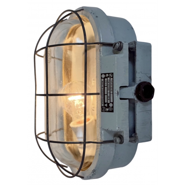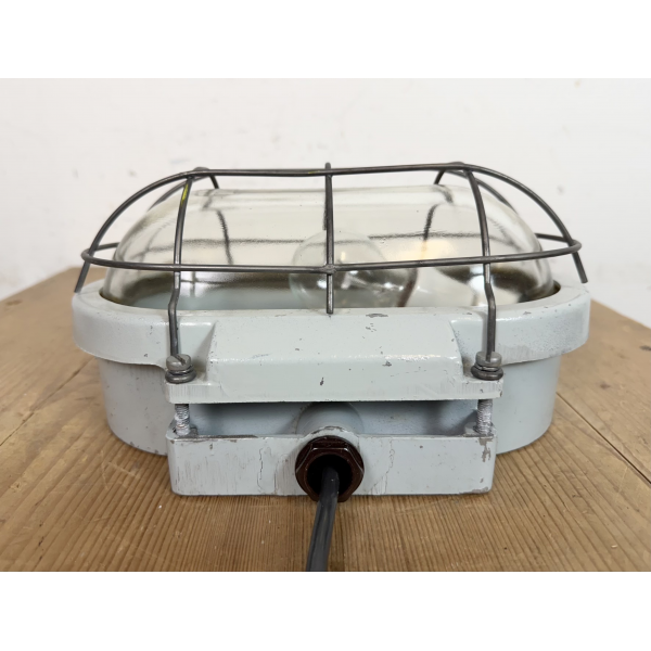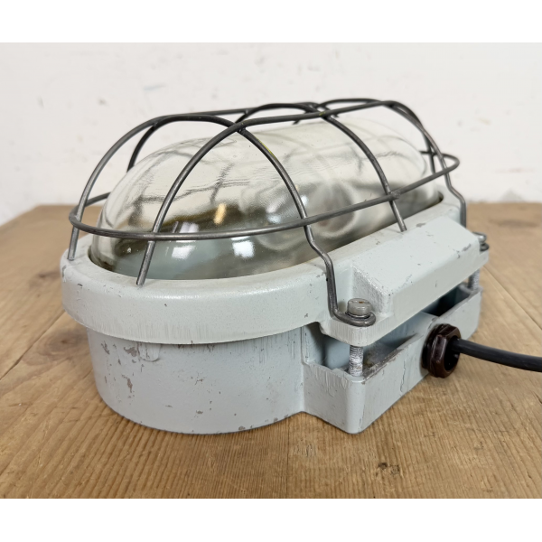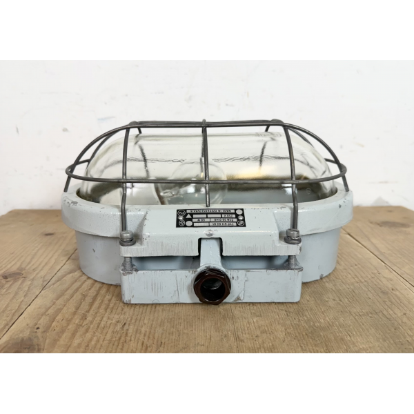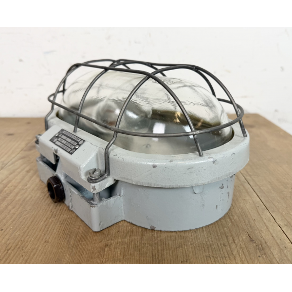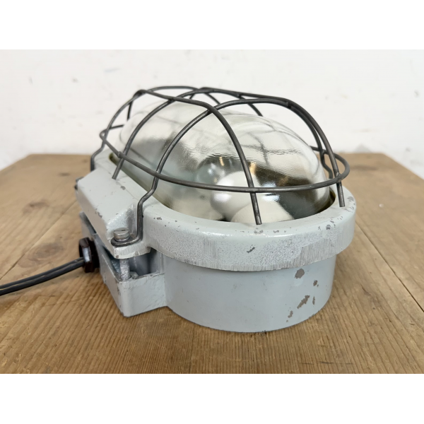 Hliníkové tovární světlo s ochranou mřížkou montáž na zeď nebo strop původně určeno do výbušného prostředí