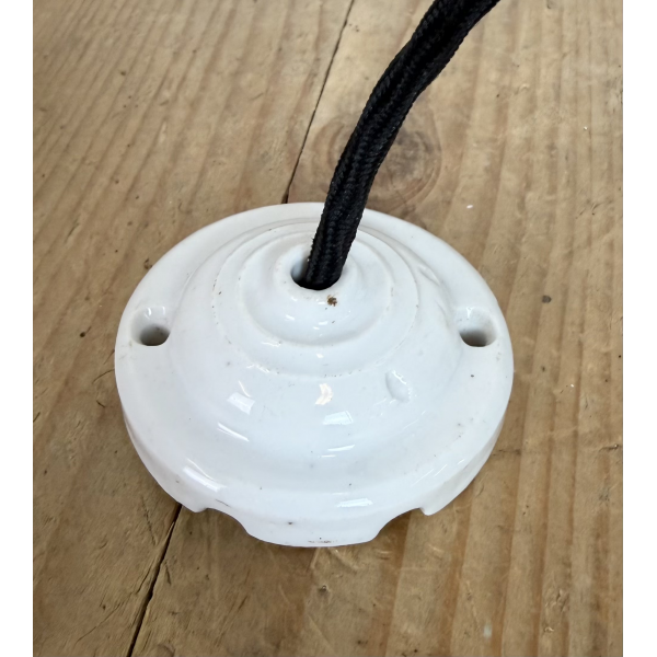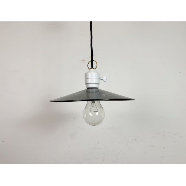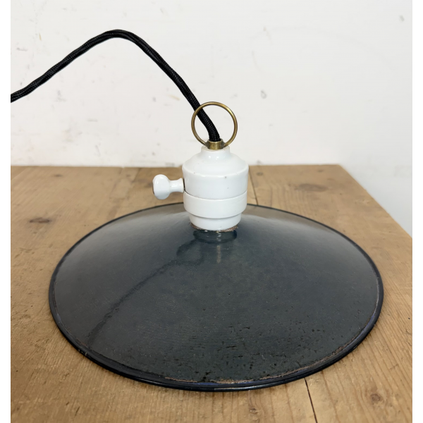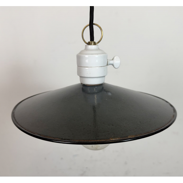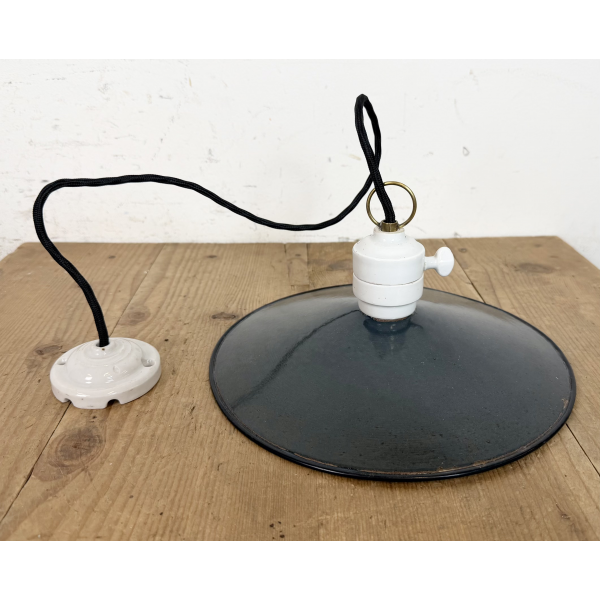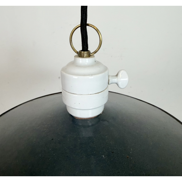 Kovová smaltovaná tovární lampa , keramický vršek s vypínačem, porcelánový baldachýn,originální tvar