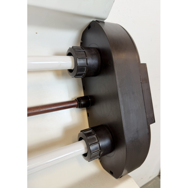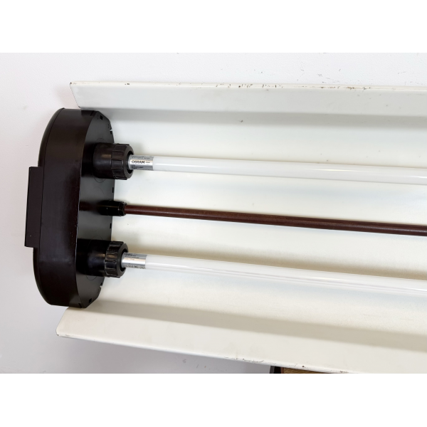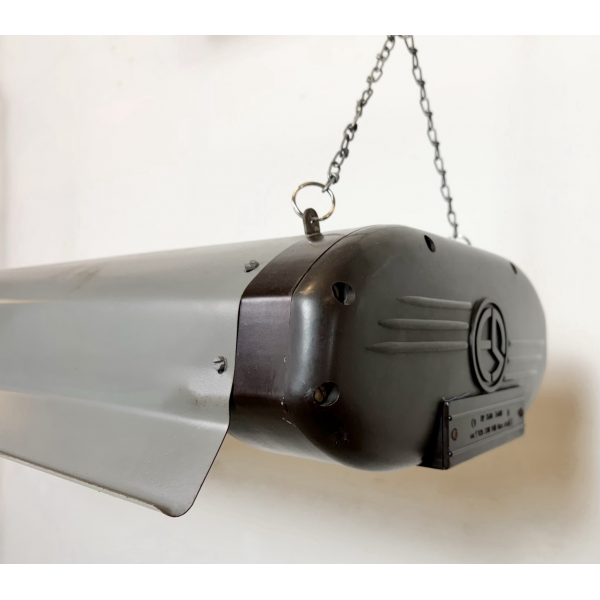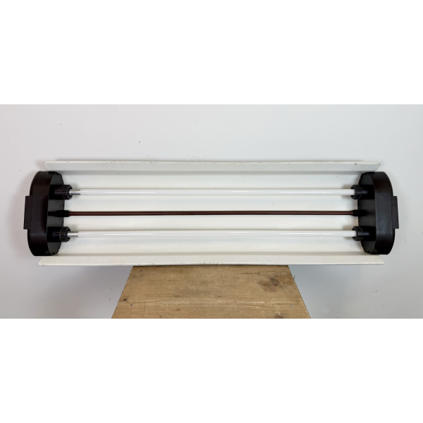 Tovární zářivková lampa , kovová konstrukce, bakelitové zakončení, předěláno na LED trubice. Trubice nejsou součástí dodávky světla