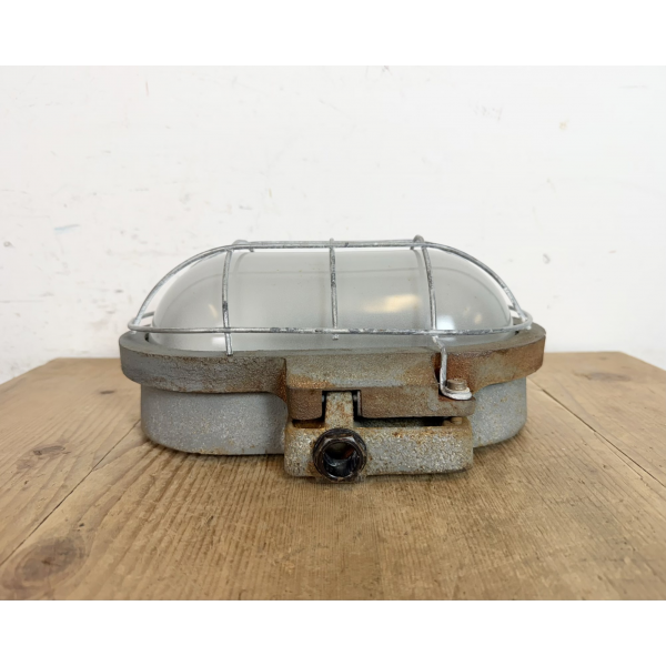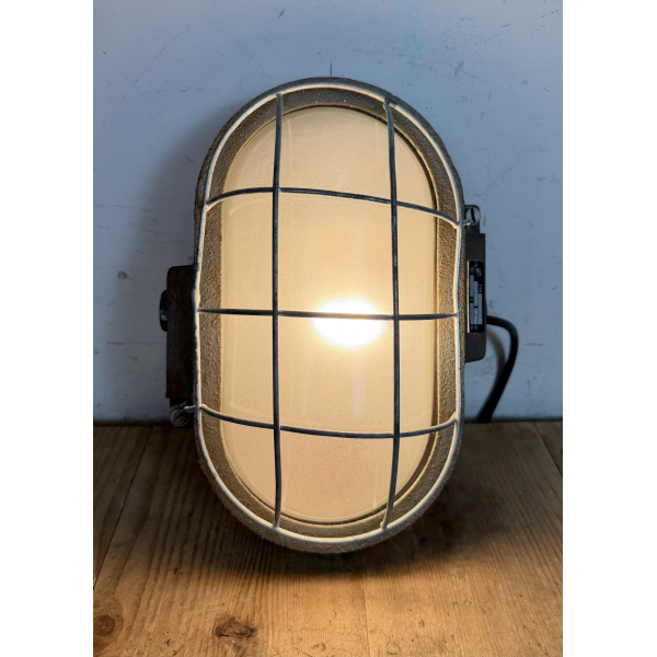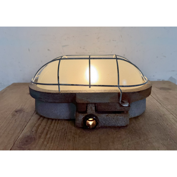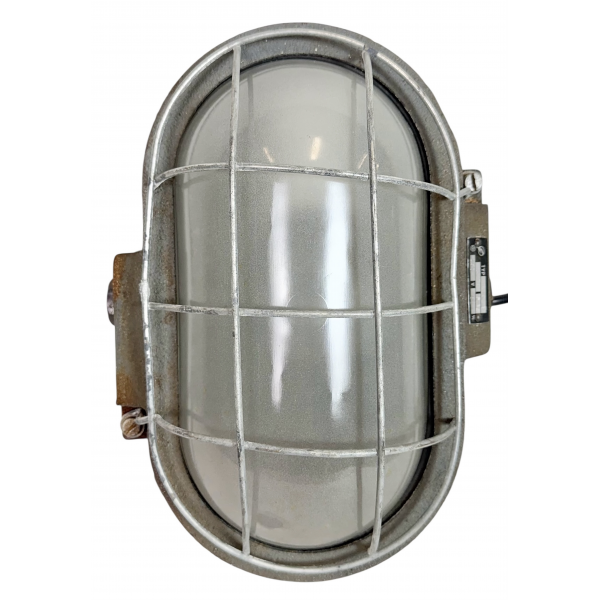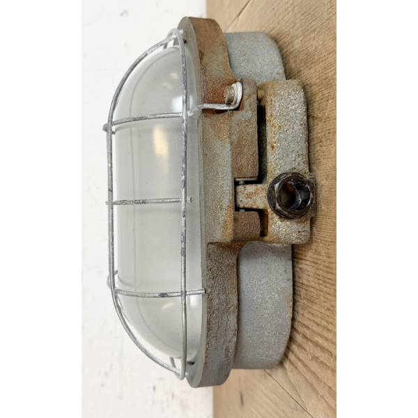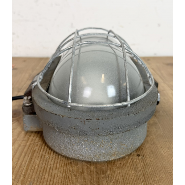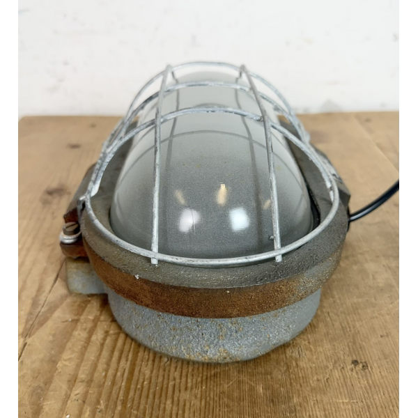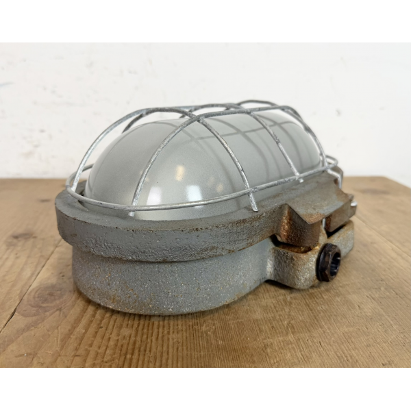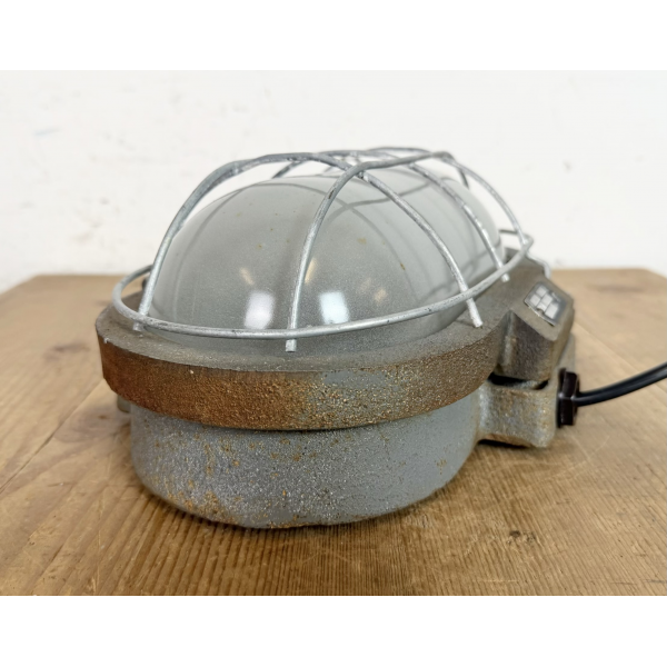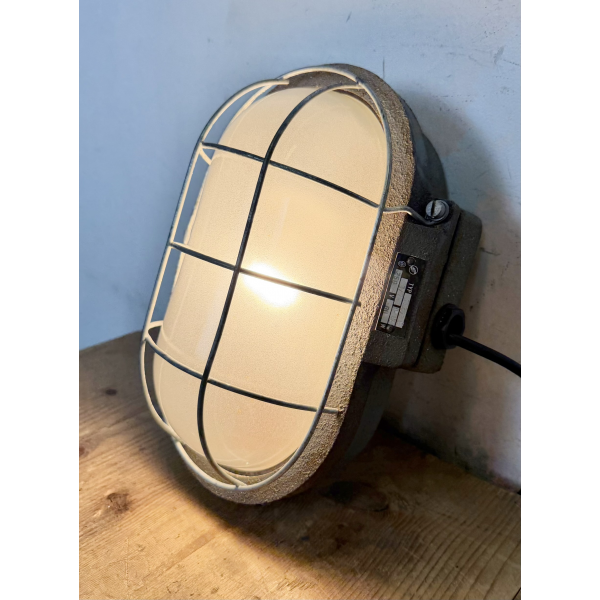Litinové tovární světlo s ochranou mřížkou montáž na zeď nebo strop původně určeno do výbušného prostředí