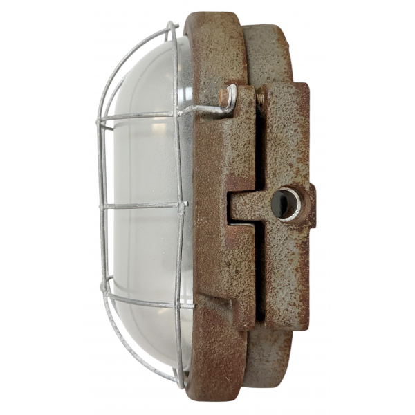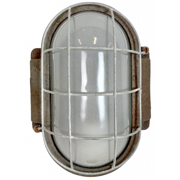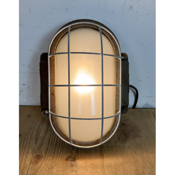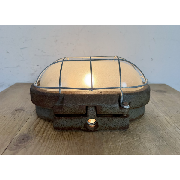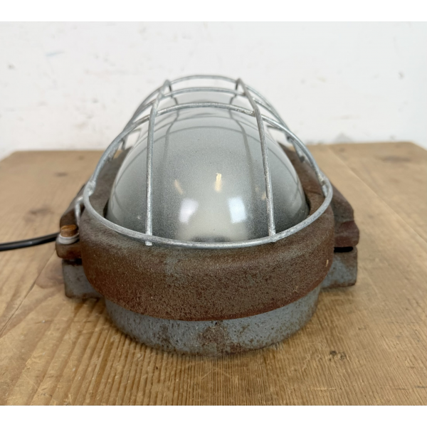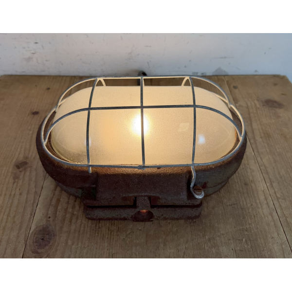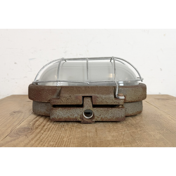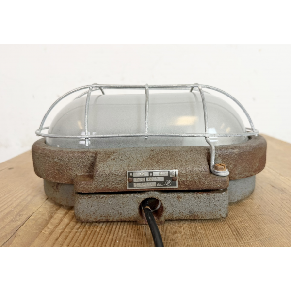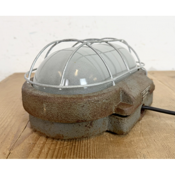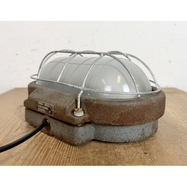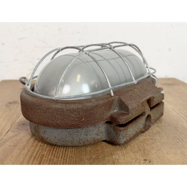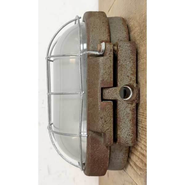 Litinové tovární světlo s ochranou mřížkou montáž na zeď nebo strop původně určeno do výbušného prostředí